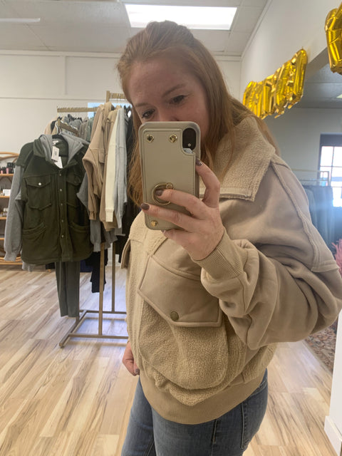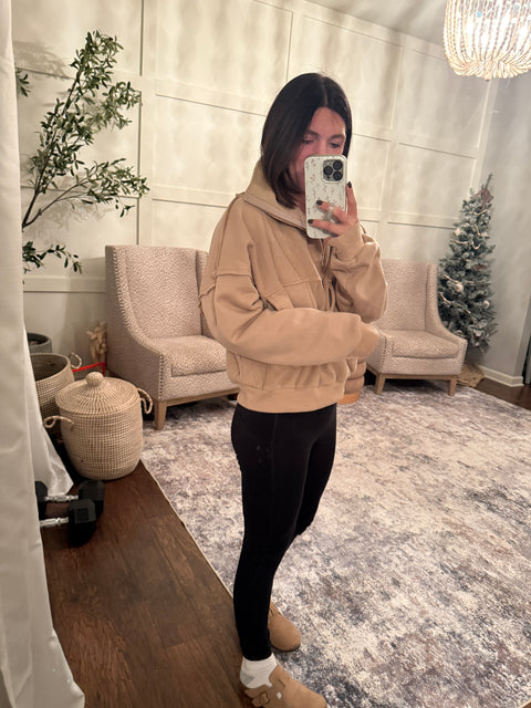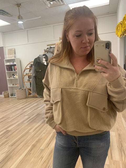 Relaxed slouchy silhouette 1/4 zip Contrast fabric 70% polyester/30% cotton true to size. Acacia is in a small